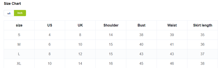 Size | US | UK | Shoulder | Bust | Waist | Skirt length |