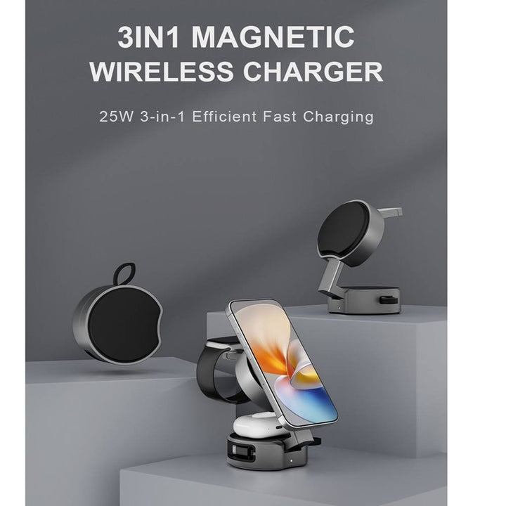 Experience hassle-free charging with the Fast 3-in-1 Magnetic Desktop Wireless Charger. Designed for iPhone, AirPods, and Apple Watch, it offers magnetic alignment, fast charging, and an adjustable stand for a clutter-free, stylish charging experience.