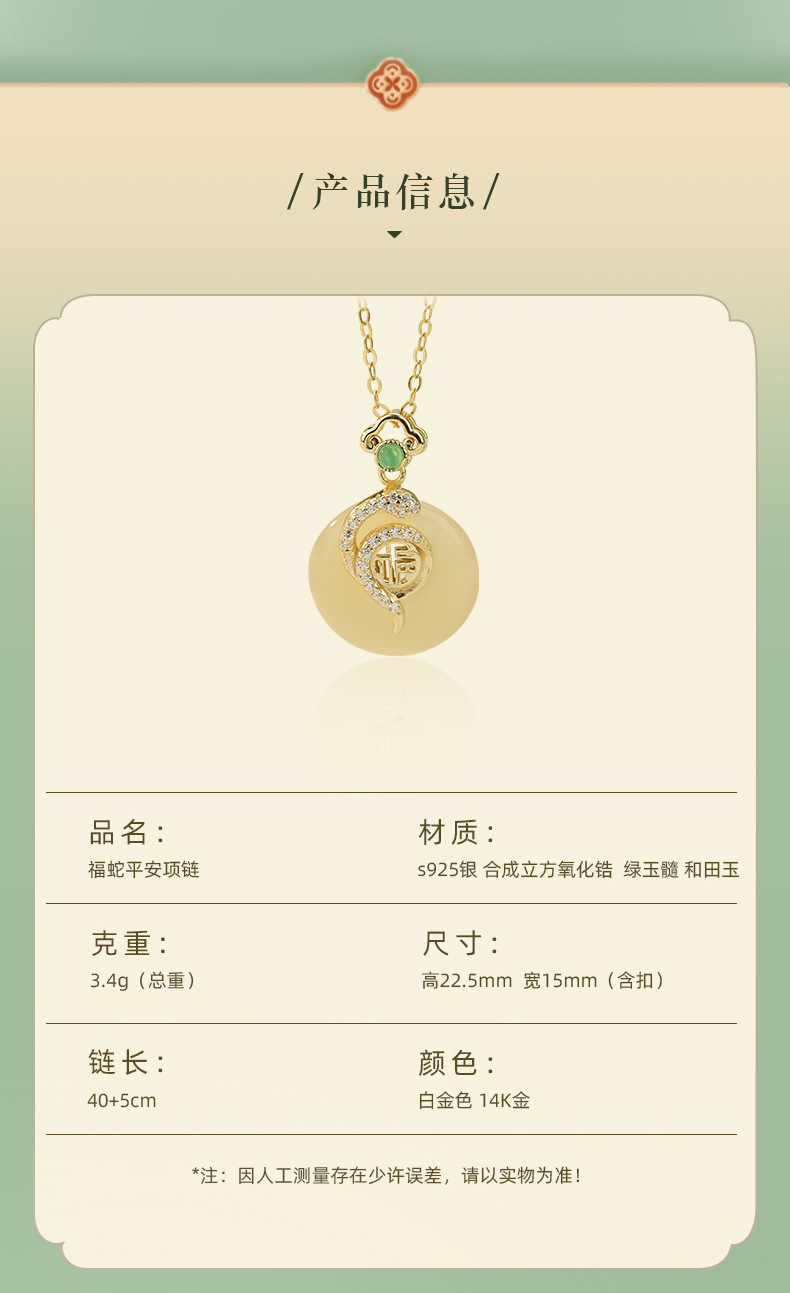 Sterling Silver Snake Chinese Style Hetian Jade Necklace