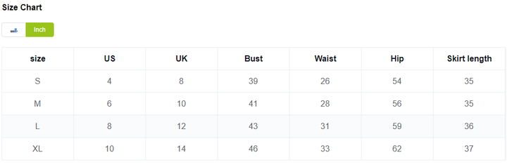 Size | US | UK | Bust | Waist | Hip | Skirt length |